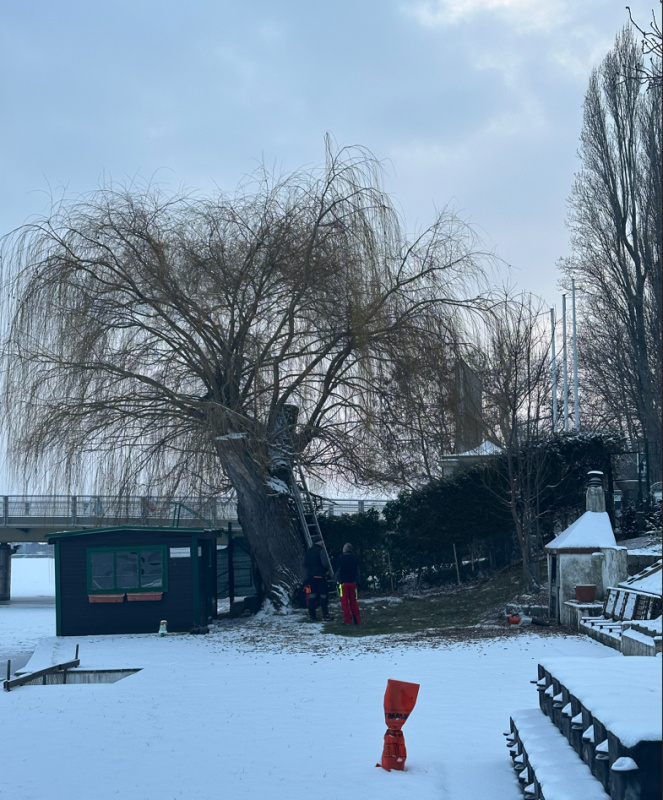 Ein Baumgutachten im vergangenen Jahr kam nun zu dem Ergebnis, dass der Baum inzwischen krank und zu stark geschädigt ist. Da seine Äste teilweise auf den öffentlichen Zugang zur Alten Donau ragen, aber auch weil wir um die Sicherheit unserer Gäste besorgt sind, musste unsere gute alte Trauerweide am 10. Jänner 2026 leider gefällt werden.